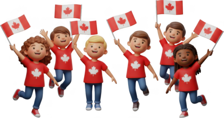 A diverse group of cheerful cartoon children wearing red t shirts with a white maple leaf design are joyfully waving Canadian flags Canada kids diversity celebration happy excited proud