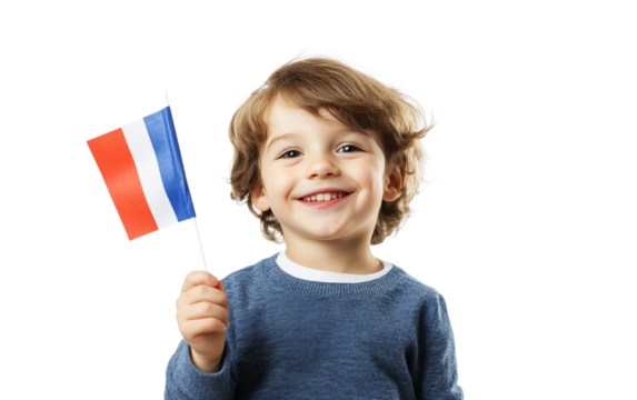 Young child holding a paper French flag and waving with excitement in casual attire