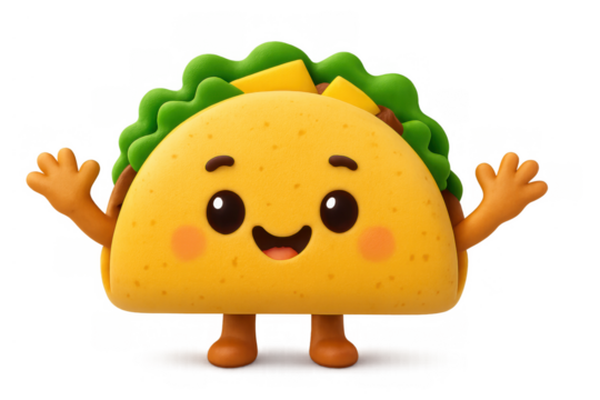 Cute happy taco cartoon character smiling and waving, celebrating mexican food and cuisine