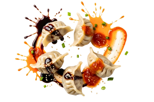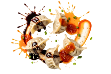 Delicious asian dumplings flying with soy sauce and chili sauce splashes isolated on transparent background