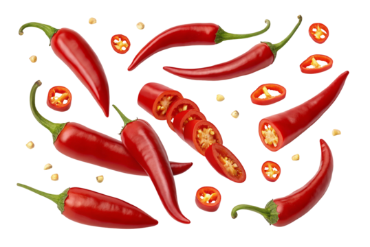 Fresh red chili peppers, whole and sliced, isolated on transparent background