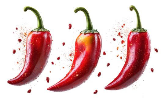 Three vibrant red chili peppers with one exploding into flakes on black isolated on transparent background
