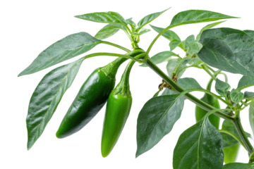 Two vibrant green chili peppers, likely jalape?s, hang from a plant branch with lush green leaves, against a solid transparent background. background removed