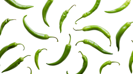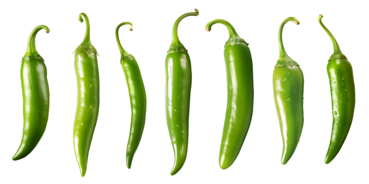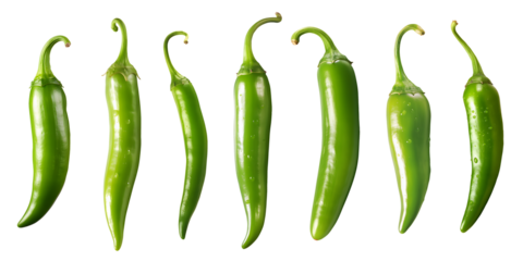 set of spicy fresh green chilli peppers isolated over a transparent background, cooking, food or diet design elements, PNG
