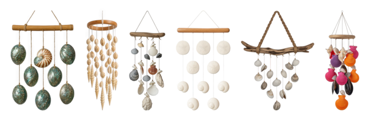 Seashell wind chimes set including abalone, nautilus, sand dollar, cowrie, and colorful scallop designs isolated. Coastal home decor and summer themes.