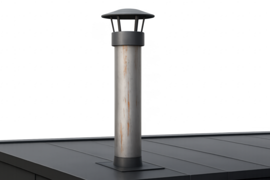Metal chimney pipe with rain cover on flat roof with transparent background