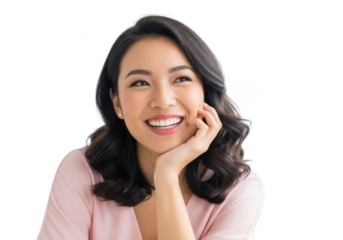 Beautiful asian woman smiling with hand on chin isolated on transparent background