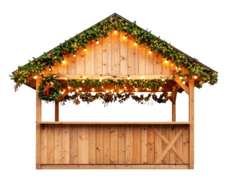 Traditional Wooden Christmas Market Stall with Garland and Lights, Isolated on Transparent Background PNG