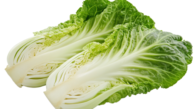A Chinese cabbage cut in half, showing the texture of the inner leaves and crisp stalks, isolated on a transparent background