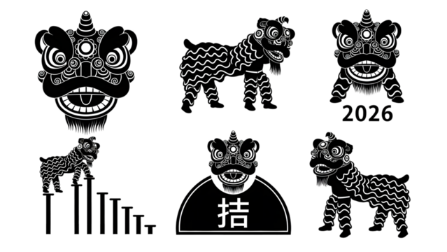 Black and white lion dance decorations with chinese characters on transparent background