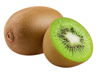 Fresh kiwi fruit and a half isolated PNG, vibrant green flesh with black seeds on transparent background, healthy eating and tropical fruit