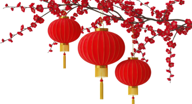 Isolated, round Asian paper lanterns hanging from flowering tree branch decoration prop