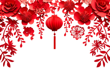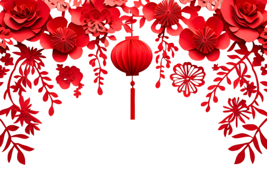 photography of a Chinese New Year red paper cut on a white clean clear isolated PNG transparent background
