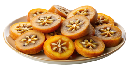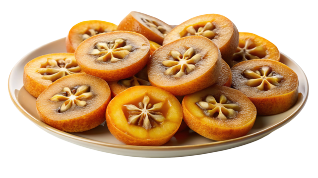 A pile of sliced loquats revealing their star shaped core and seeds isolated on transparent background
