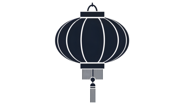Black chinese lantern with white lines hanging from a hook on a transparent background