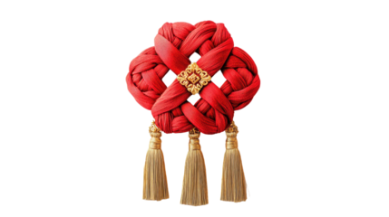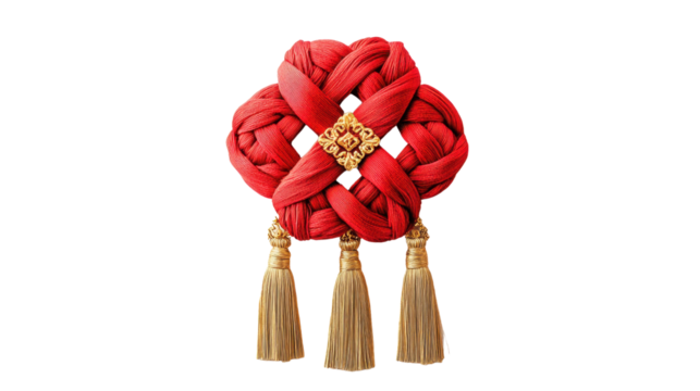 A beautifully crafted Chinese knot in vibrant red silk, intricately designed with elegant loops and symbolic patterns
