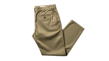 Four neatly folded khaki chinos stacked on a transparent background, offering an organized display perfect for showcasing apparel design and highlighting casual menswear fashion