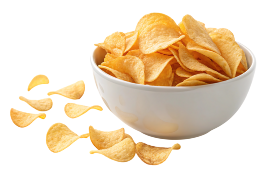A close-up view of a pile of crispy. golden potato chips arranged artistically on a white background. their texture and color. ideal for food-related content or advertisements