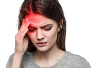 PNG of Stressed young Caucasian woman struggling with a headache, holding her head in discomfort against a neutral backdrop.