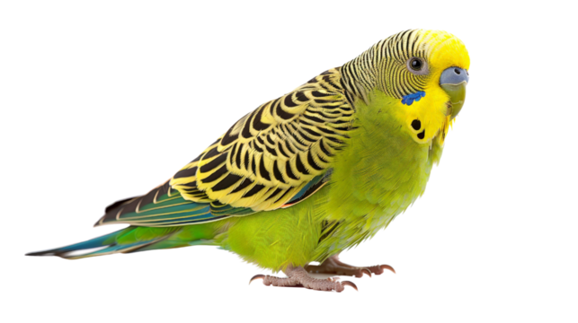 Close-up of a vibrant green and yellow budgerigar parrot standing gracefully with a clean white background.