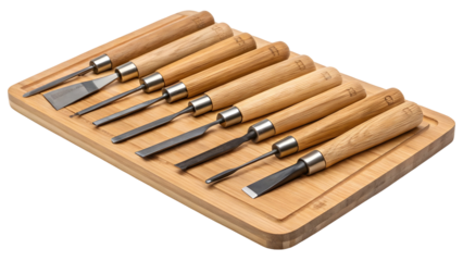 Collection of eight wood carving chisels with wooden handles arranged on a wooden board isolated on a transparent background