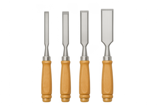 Set of four wooden-handled chisels with polished metal blades arranged in a row on transparent background.