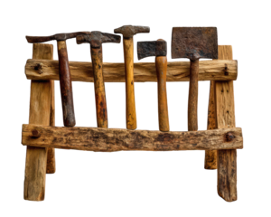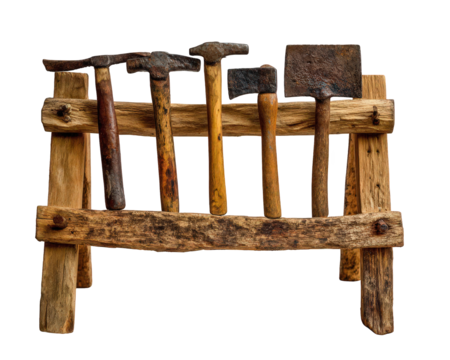 Rustic Wooden Rack with Vintage Hammers and Chisels