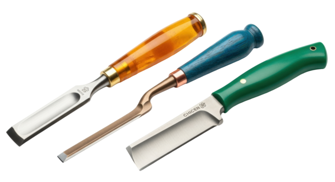 Three woodworking chisels with wooden handles isolated on transparent background, png