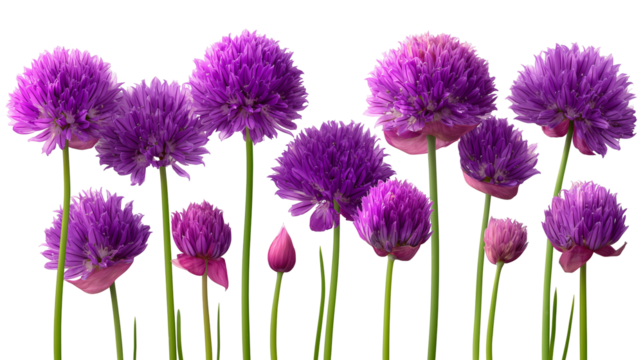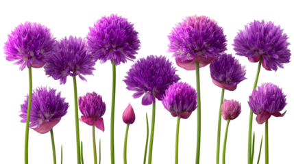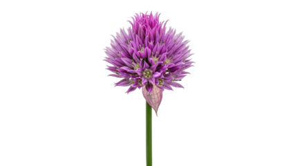 Chive flower blooming, a purple blossom head closeup with a green stem, isolated on a transparent background