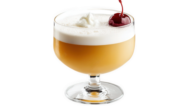 stylish cocktail served in a coupe glass. showcasing a creamy. frothy top with a bright red cherry garnish the drink has a golden hue. suggesting a fruity flavor profile. and is presented against a cl