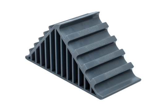 Black rubber wheel chock with textured grip and ridged surface isolated on transparent background