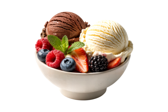 A bowl of chocolate and vanilla ice cream topped with a fresh mixed berry salad isolated on transparent background