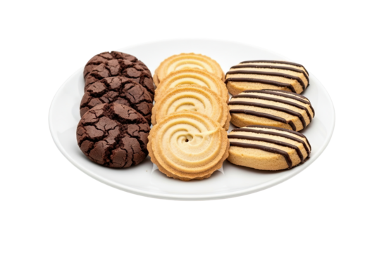 An assortment of delicious chocolate crinkle, butter swirl, and shortbread cookies with chocolate drizzle served on a white plate and isolated on a black background