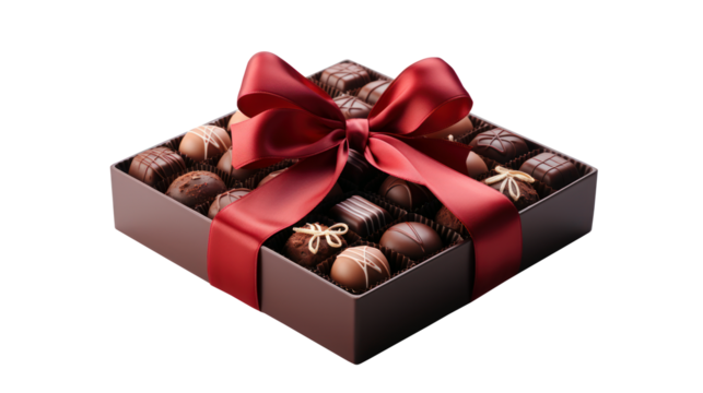 Assorted chocolates, various gourmet chocolates in a gift box with an elegant red ribbon