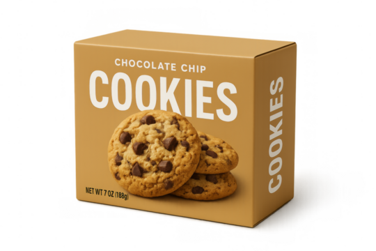 Open white bakery box featuring four chocolate chip cookies. Macro shot shows clean, isolated container with light brown, slightly wrinkled cookie texture against white background. Perfect for fresh