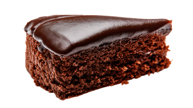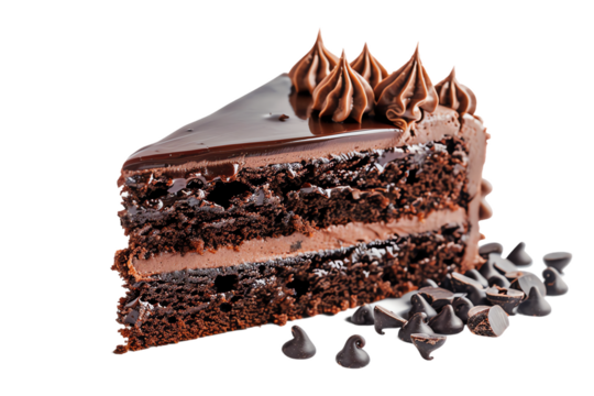 A piece of chocolate cake with a chocolate frosting on top isolated on a transparent background