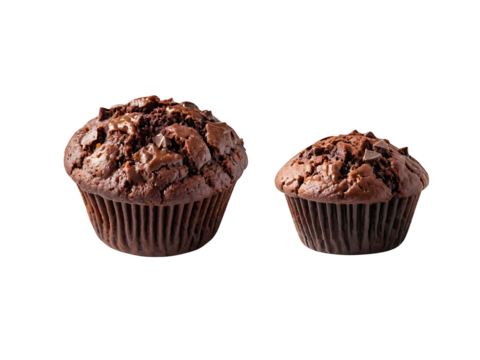 Three chocolate chip muffins displayed against a transparent background