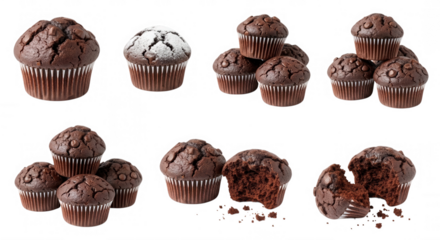 Chocolate chip Muffin, Chocolate cupcake dessert Set of cakes chocolate muffins from different angles, transparent background