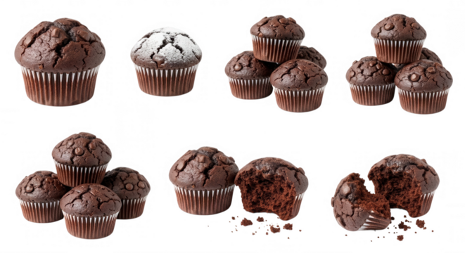 Plain muffin muffins with chocolate chips on transparent background, PNG file. Various design angles showcasing delicious baked goods, ideal mockup template for artwork or digital designs.