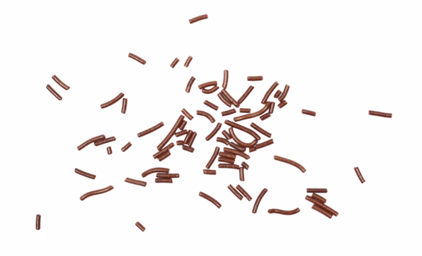 Chocolate sprinkles pile, granules scattered isolated on white, top view