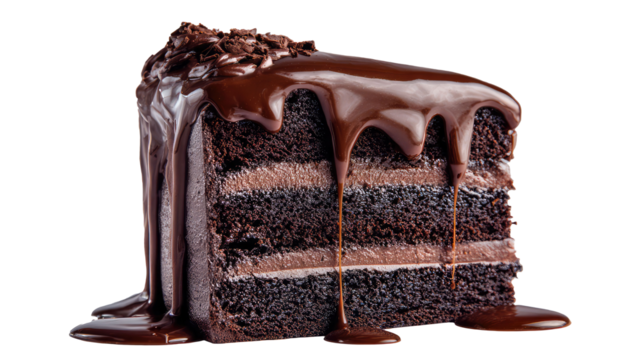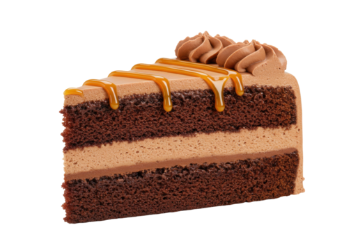 Isolated chocolate cake slice, caramel drizzle and mousse layers, perfect for birthdays