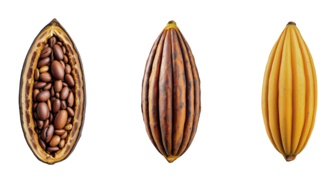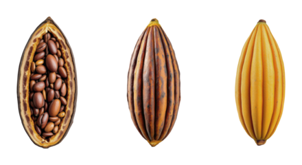 Vibrant cocoa pods, beans, and fresh leaves against a clear backdrop