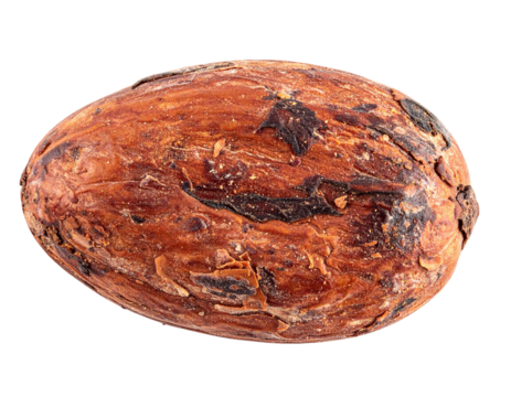 Whole raw cacao bean representing natural chocolate ingredient, ideal for food production and healthy snack concepts on transparent background