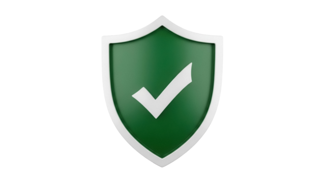 Green shield with check mark isolated PNG, security and protection symbol on transparent background for graphic design and web use