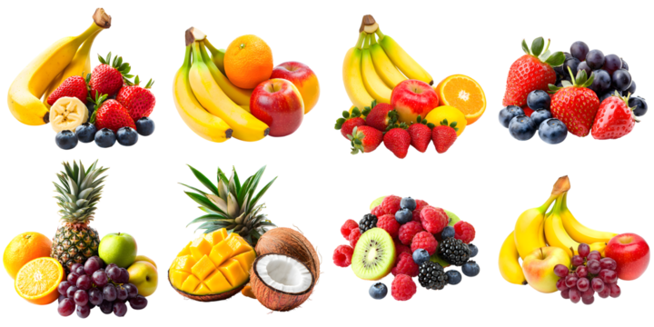 A selection of various juicy, healthy fruits and berries isolated on a transparent background PNG