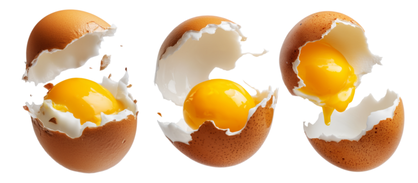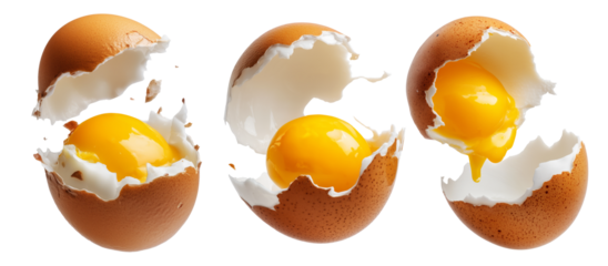 Cracked brown egg with intact yolk and broken shell in high detail, isolated on white transparent background