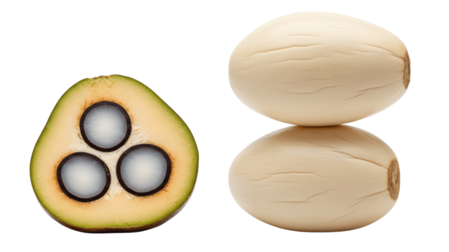 Sliced peach palm fruit isolated PNG on transparent background, tropical ingredient for culinary use and healthy eating