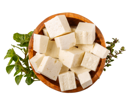 Brynza cheese isolated on white background. Diced soft sheep's cheese bryndza in wooden bowl. Top view.