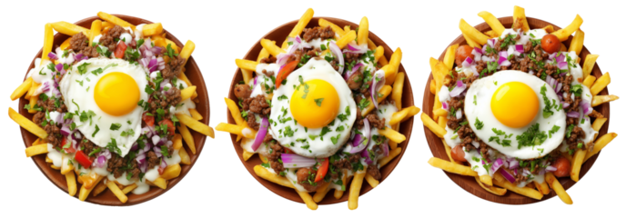 Chile Chorillana french fries topped with ground beef, sunny-side up egg, cheese, onions, herbs on wooden plate, isolated on white