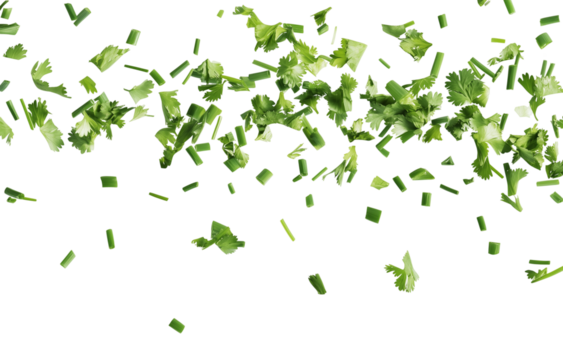 Chopped fresh green cilantro and parsley herbs, with clear contours and distinct boundaries, naturally scattered on a seamless transparent studio background with copy space, top-down view, shadowless